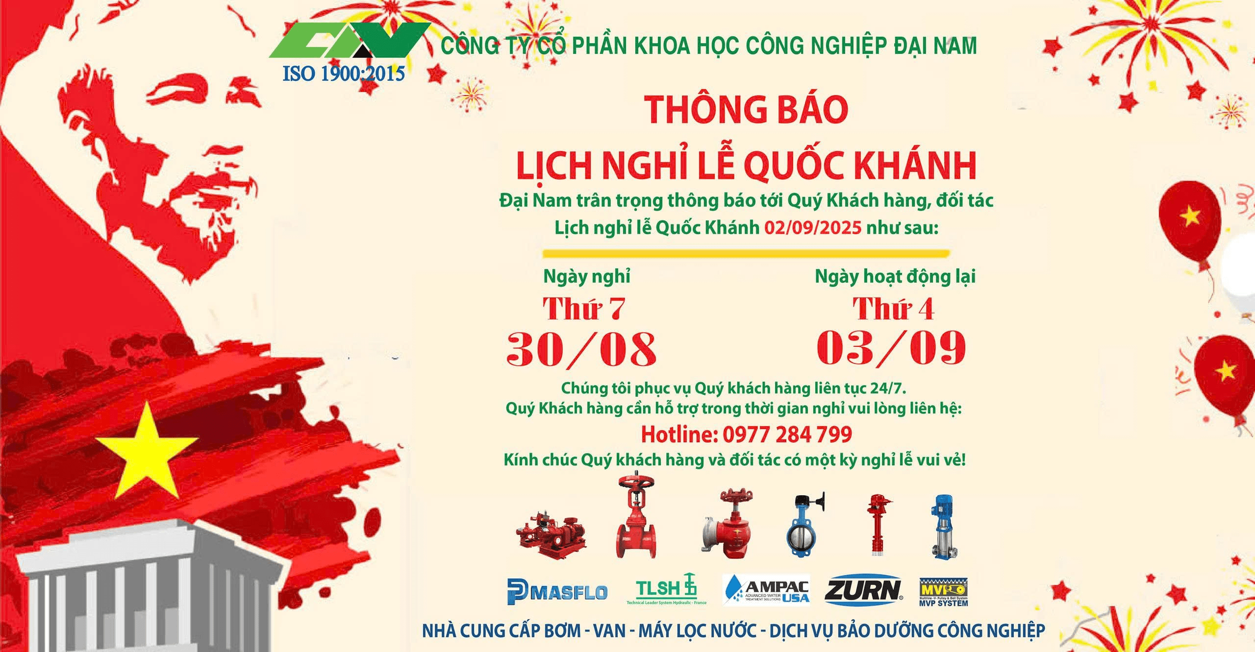 Nhân dịp kỷ niệm 80 năm Ngày Quốc khánh nước Cộng hòa Xã hội Chủ nghĩa Việt Nam (02/09/1945 – 02/09/2025), Công ty Đại Nam xin trân trọng thông báo lịch nghỉ lễ như sau: